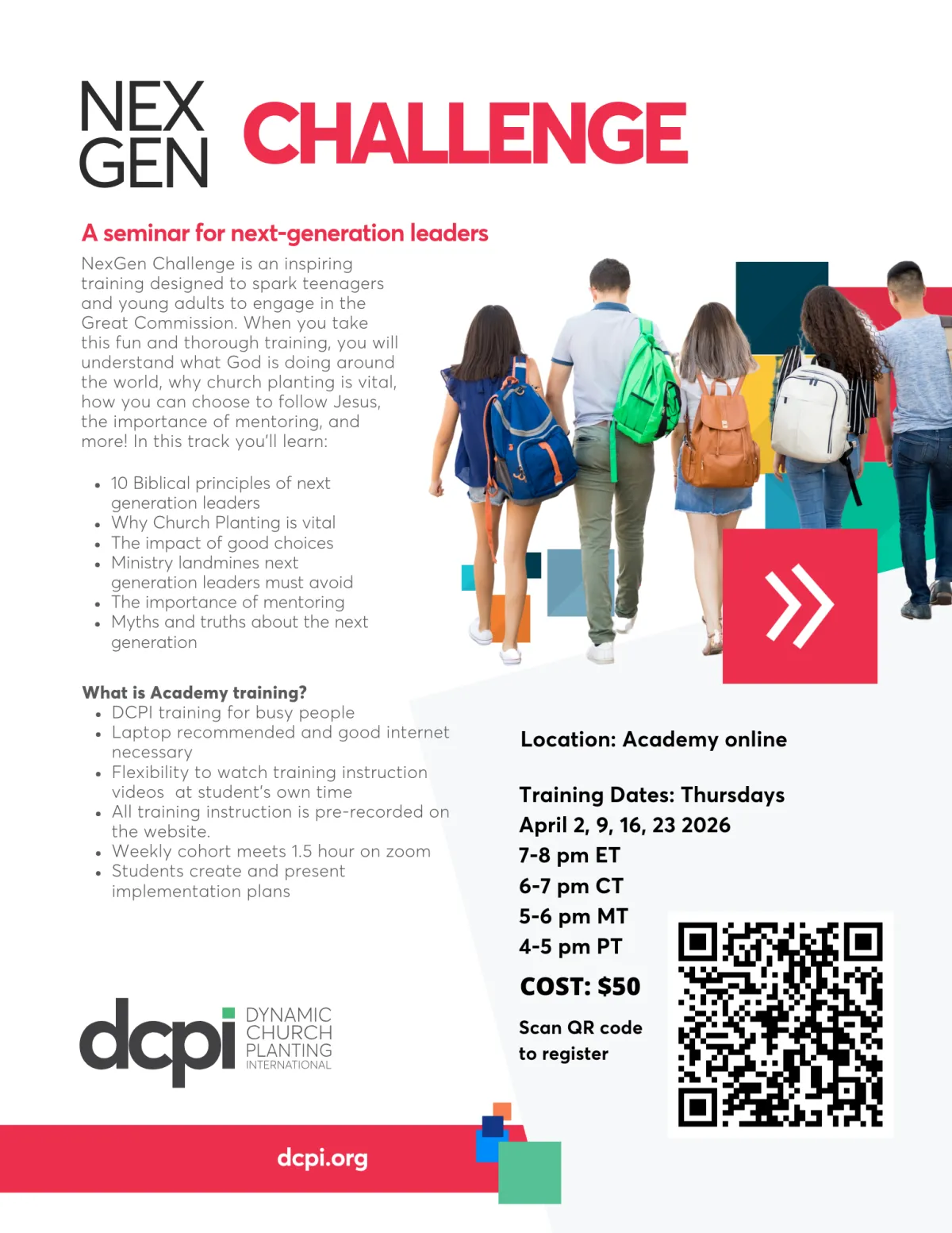 The purpose of the NexGen Challenge training is to inspire next generation leaders to embrace church planting to reach the world for Christ. This training will inspire young leaders about discipleship and church planting, as they explore their own calling in God’s kingdom. This training instruction is accessed through Online Academy. Registrants also meet one hour per week on Zoom for 4 sessions.